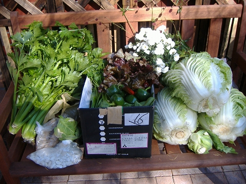 お客さまから長野のりんごを頂いたのをかわきりに、青森の紅玉、千葉のピーナッツ、ひじき、お米その他諸々の千葉産の品々、いつもの野菜作りの名人のところからのダンボウル3個以上の地元の野菜、さらにお客さまからのキャベツとお米と台所に入りきれないほど。