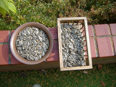 寒い朝、小鳥のえさのひまわりの種を購入。早速二つの餌台にいっぱいの種を入れて置いた。
